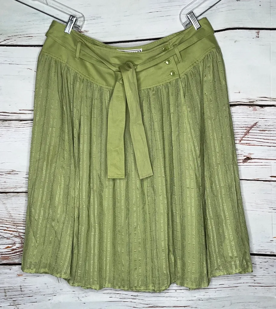 Carlisle Size 18 Green True Wrap A-Line Skirt with Tie Belt. Belt Loops. 4 Button Closures. Fully Lined. Shell is Silk - Combo is Cotton/Linen Blend - Lining is Polyester. Good Pre-Owned Condition - Flaw: There is 1 small stain. Length is 26” & Waist is 19”. Measurements taken while garment is laying flat.