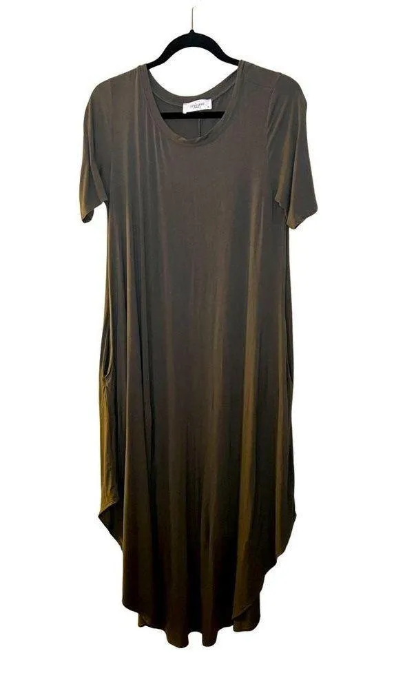 . Preowned, in good wearable condition. Neck is a tiny bit stretched out, see pics please Super Soft Buttery Material Pockets Sides are Shorter on Bottom 92%Rayon, 8% Spandex Flat Lay Measurements- 19” Chest, 54” Length (longest point)