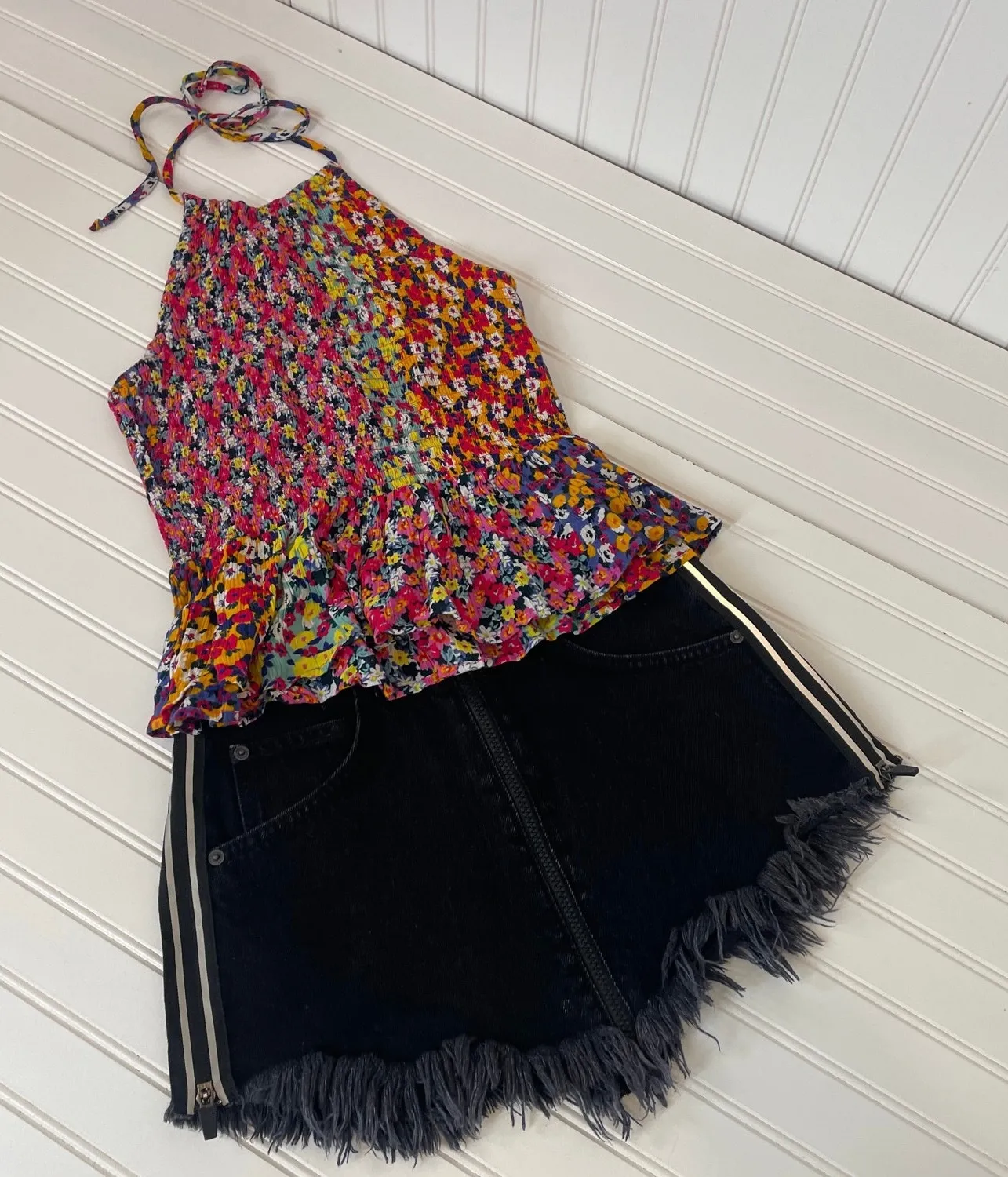 SET OF 2; 1 - Patrons of Peace Ruffled Hem Floral Halter Top Size S 1 - Carmar Raw Hem Skirt Size 25... Show more
