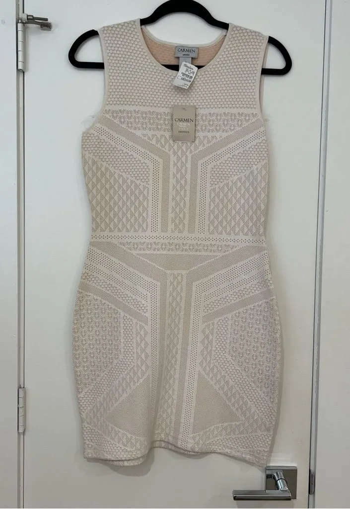 From Neimans , body con dress with geometric print that kind of looks like lace. Super comfortable and flattering Great for cocktail party, showers, luncheons M fits 6-8, is very stretchy 0393