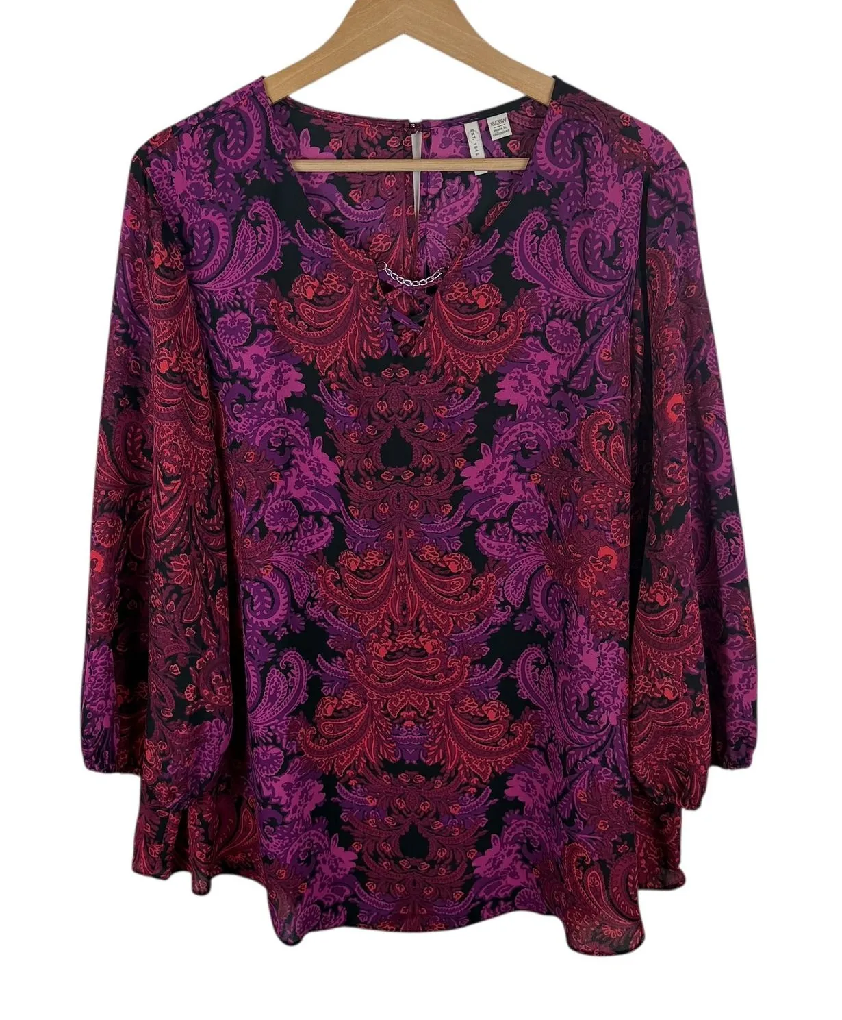 Good Pre-Owned Condition (see pics for details) Flaws: Has rip on seam in back. Paisley print chain neck v-neck blouse top. A vibrant long sleeve top featuring a flattering V-neckline with a decorative silver chain accent and lace-up detail. The eye-catching paisley pattern in shades of magenta and red adorns the flowy silhouette, while the bishop sleeves add a touch of elegance. Perfect for a night out or a stylish brunch. Type: Blouse Department: Women Style: Tunic Material: Polyester Neckline: V-Neck Sleeve Length: Long Sleeve Sleeve Type: Bell Sleeve Pattern: Paisley Accents: Strap Theme: Bohemian Features: Lightweight, Easy Care Fit: Relaxed Fabric Type: Chiffon Occasion: Casual, Party/Cocktail Closure: Pullover Keywords: paisley, chain detail, lace up, bishop sleeve, plus size, v neck, boho, feminine, statement top, fall fashion, spring style, evening wear, casual chic, Plus Size Boho Blouse, Paisley Print Top, EST1946 Blouse, Chain Detail Top, Red Purple Black Shirt, Bohemian Chic, Festival Blouse, Long Sleeve Top, 18W 20W Blouse, Trendy Plus Fashion, Elegant Work Top, V Neck Flowy Shirt Measurements: included in photos. Please compare the measurements to something you already own for a great fit! Fast shipping: Shipped out next business day! Please let us know if you have any questions!