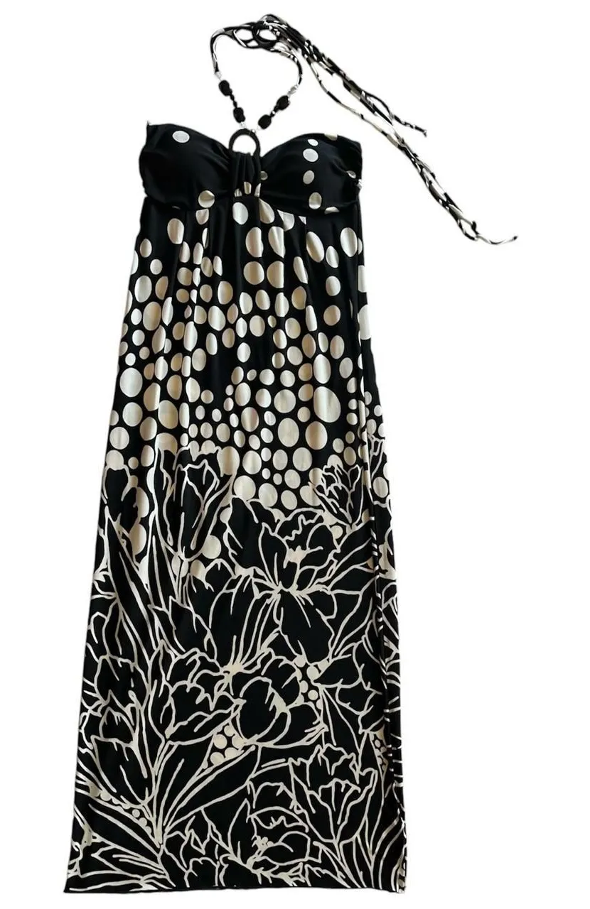carole little black and white floral print maxi beaded halter dress, size 4 the ties are beaded, ver... Show more