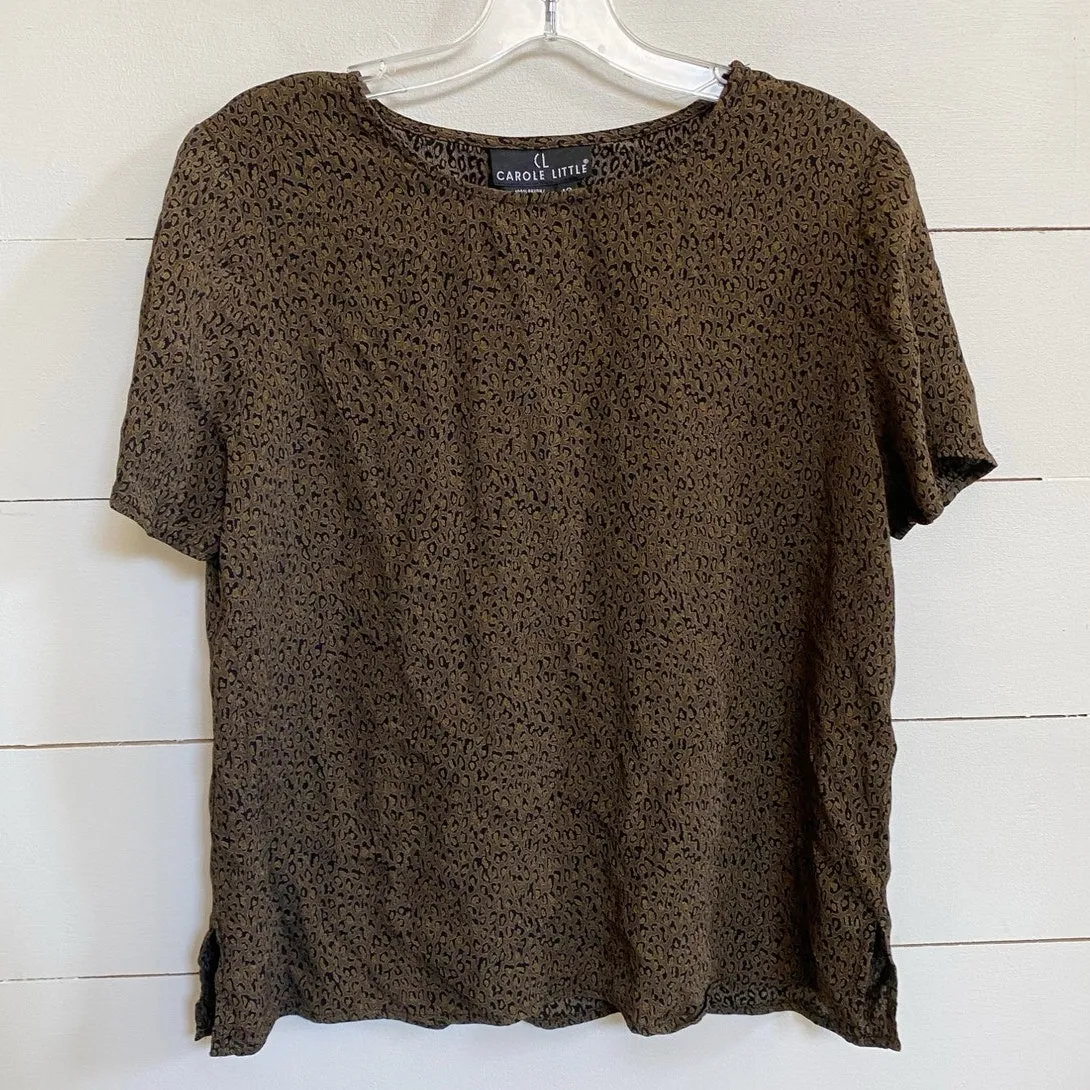 Dressy lightweight blouse from Carole Little in allover cheetah print Size 12 Short Sleeve Round Neck Brand: Carole Little Department: Women's Excellent Pre-owned Condition - no holes, or tears Measurements taken flat: Armpit to armpit: 20" Shoulder to hem length: 22.5" 100% Rayon Dry clean only Color: Multicolor brown/ black Type: Blouse Open to offers Fast shipping Smoke Free home stylish fashion designer pullover church dressy animal print lover cheetah leopard cat print office easy casual office