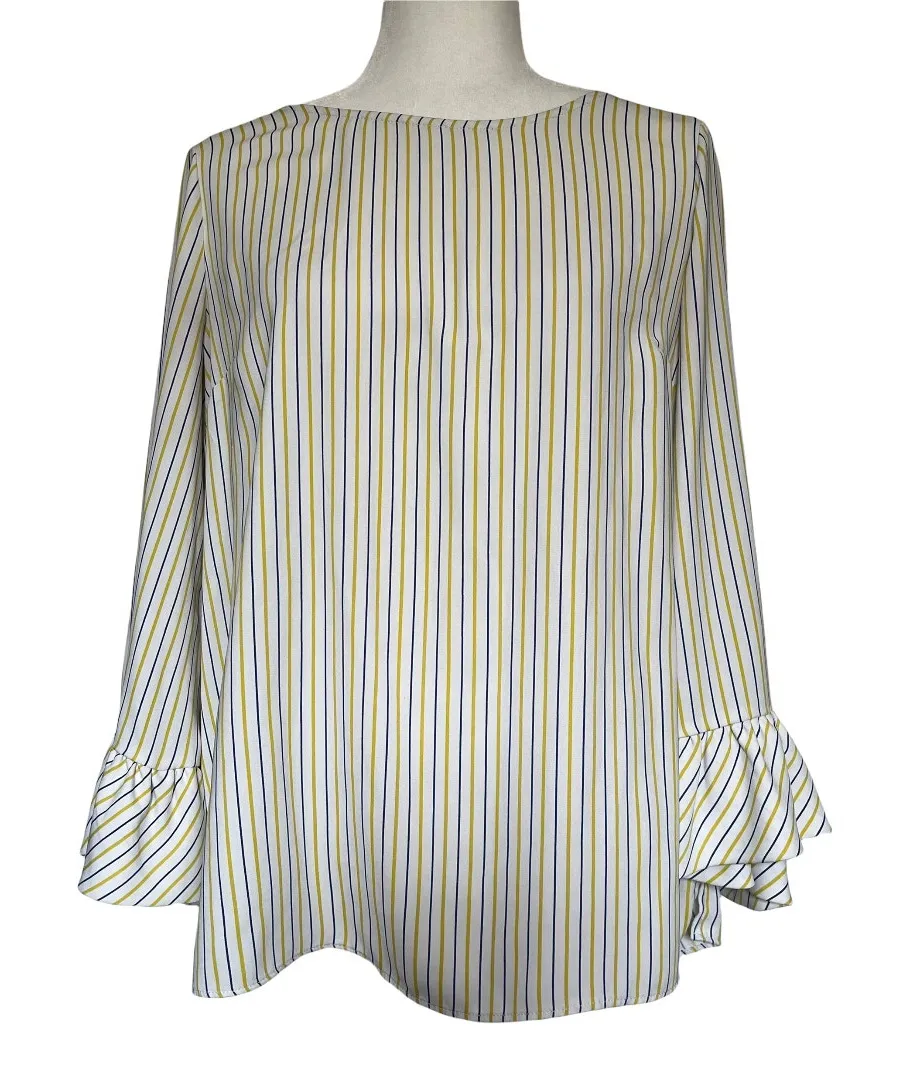 White Carolina Belle bell Sleeve Vertical Stripe Top Preppy Coastal Keyhole button back closure Round neck, side slits, 3/4 sleeve, Darting at bust Stripes in lime green and blue Excellent pre-owned condition, please see photos Size Large 100% Polyester Approximate measurements: Pit to pit: 21" Shoulder to hem: 26.25" Sleeve length (underarm to cuff): 13.5" Carolina Belle Montreal, striped blouse, yellow blue white stripes, ruffle sleeve, bell cuff, preppy office, coastal chic, resort wear, French girl style, Parisian classic, minimalist stripe, nautical influence, feminine work top, spring blouse, old money preppy, coastal grandmother, soft color palette, lightweight polyester, casual elegant