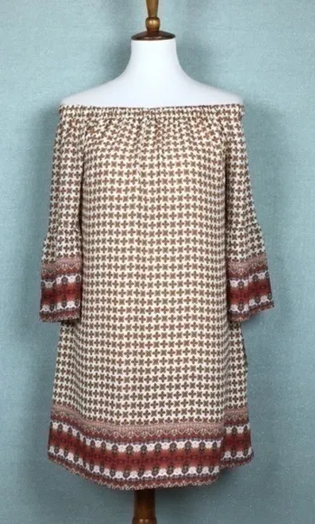 Carolina Belle Bohemian Off The Shoulder Dress Size: 4 Brand: Carolina Belle Materials: 100% polyester - Chiffon dress - Off the shoulders - Bohemian printed dress - Elastic band at the top This item is NWT in excellent condition and comes from a smoke-free home.