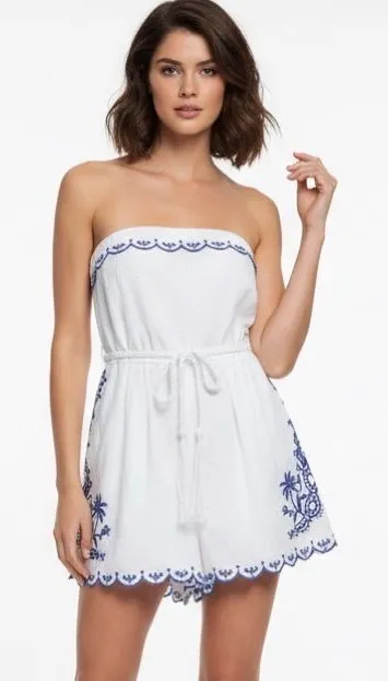 Size Large New with tags. Details: ∙ Strapless design with smocked back ∙ Blue embroidered palm trees and decorative trim ∙ Scalloped hem detail ∙ Includes matching rope belt ∙ 80% Linen, 20% Cotton ∙ Bust measurement: approximately 18”across (laying flat) ∙ Machine wash cold, gentle cycle This designer piece combines luxury resort style with breezy summer comfort. Dress it up with wedges and statement jewelry or keep it casual with sandals for effortless vacation style.