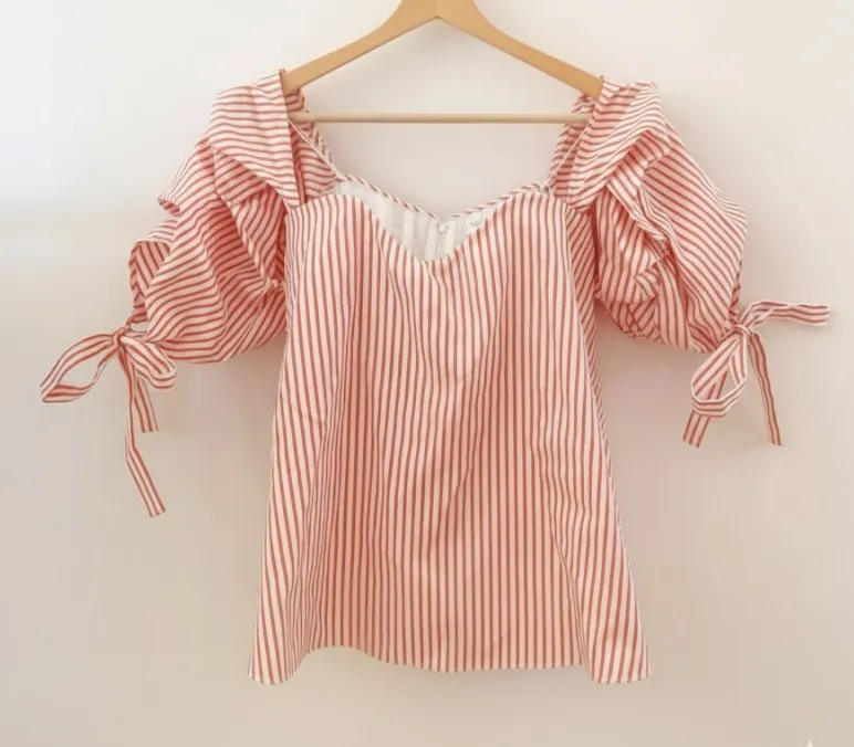 Stylish off-shoulder blouse with coral striped pattern. Ideal for casual wear. Elegant top with coral and white stripes. Features a modern design. Chic off-shoulder design with coral color striped pattern. Stylish and versatile. 100% Cotton Made in USA. Back Zipper. Built in boned bodice (basically strapless bra) built in for support and structure. Sweetheart neckline. Pin tacked off the shoulder sleeves with bow tie trim Size Small. Off the shoulder, strapless, sleeveless, coral, striped, sweetheart neckline, bones bodice, cotton, luxury, nwt, versatile, coastal, coastal cowgirl, coquette, beachy, resort, vacation, elegant, on trend, New England