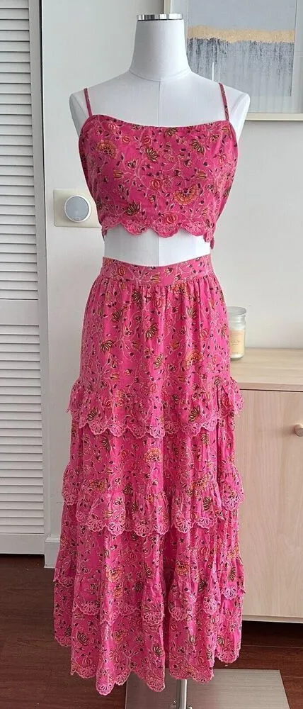 Caroline Constas Skirt Womens Large Floral Lace Tiered Crop Top Matching Co Ord Incredibly beautiful 2 piece skirt set. Midi Skirt and crop top Floral prinkt print, scalloped lace detailing. 100% cotton with a soft viscose lining Size Large Armpit to armpit 18'' Waist of the skirt 16'' Flat and the waist is elastic at the back