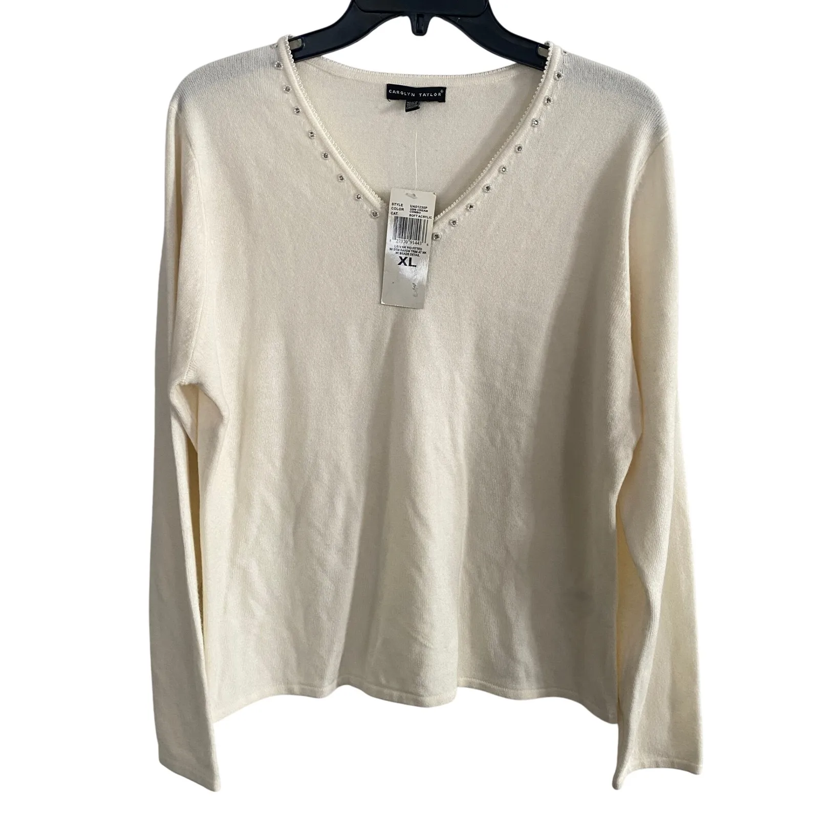 New with Tag Women's Sz XL Please see all photos for close up details and measurements Style: Pullover Department: Women Material: Acrylic Sleeve Length: Long Sleeve Theme: Classic Type: Sweater Neckline: V-Neck Features: Classic Style, Lightweight Pattern: Solid Sleeve Type: Raglan Sleeve Fabric Type: Knit Accents: Beaded Keywords: Carolyn Taylor, cream sweater, embellished sweater, beaded sweater, V neck sweater, long sleeve sweater, XL sweater, women's sweater, classic sweater, new with tags, NWT, sweater, knitwear, acrylic sweater, winter sweater