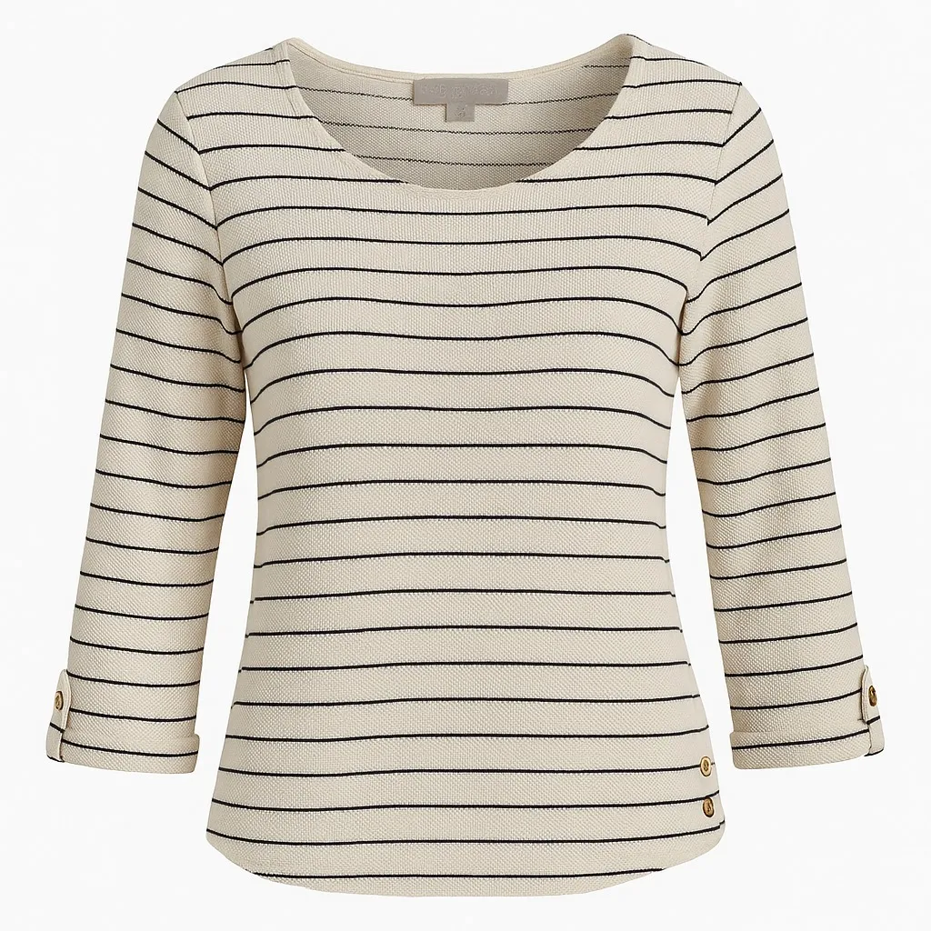 * Soft cotton-blend knit with a textured finish for comfort and shape retention * Classic black stripe pattern on neutral cream background * 3/4 sleeves with decorative gold-tone button details at cuffs * Side hem button accent adds a modern, nautical touch * Easy pullover design — perfect for layering or wearing solo * Machine washable (cold water, gentle cycle) * Great for casual, office, or weekend wear * Good pre owned condition, no flaws * Main Photo is used to show what item will look like on