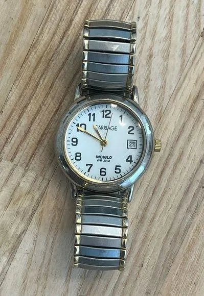Brand: Carriage by Timex Model: Indiglo WR30 Gender: Ladies Description: Gorgeous white dial, black and gold tone hands and markers. Two Tone Stainless Bracelet. Date window. Water resistant 30 meters. Condition: Great, has a small scratch on the crystal. Band/Bracelet Type: Two Tone Stainless Steel Bracelet Date Window?: Yes Power Type?: Quartz, Battery New Fresh Battery Installed?: Yes Box?: No Additional Links?: No Notes: Please see pictures for condition and measurements. Watch pillow are for photography staging only and are not included, unless otherwise stated. From a smoke free, pet free home. Condition Notes: -NWOT: New Without Tags. Brand new item. May have super light handling marks, if any. Item may have been a window display item for a short time before safe storage. -Like New: Extremely minor handling or wear marks, if any. Item may have been worn once or twice. -Excellent: Minor, but more noticeable light wear marks on band, case, and/or very light scratches on crystal, if any. -Great: Above average condition for the age of the watch. Light to moderate surface wear or scratches. -Good: Expected wear marks for typical standard use for the age of the watch. Noticeable surface scratches on band, case, and/or crystal. Watch is in good working order. Watch need additional cleaning/polishing. -Other: Will be described if applicable. Watch may not be functional, have damage, or need major repairs.