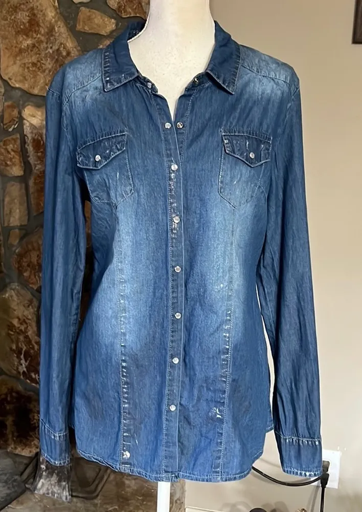 This long sleeve denim shirt from Cartise is unique and it is in great preloved condition! US size 8 It snaps down the front There are two front chest pockets with snap closure Collared 100% cotton This shirt has a distressed look with silver metallic “rubbings” or markings on it. See closeup photos of collar and back as examples Center back length is approximately 28” from the collar seam to the bottom Laying flat and when the front snapped armpit to armpit measures approximately 19 1/2” There are no holes or stains and this shirt is from a smoke free home.