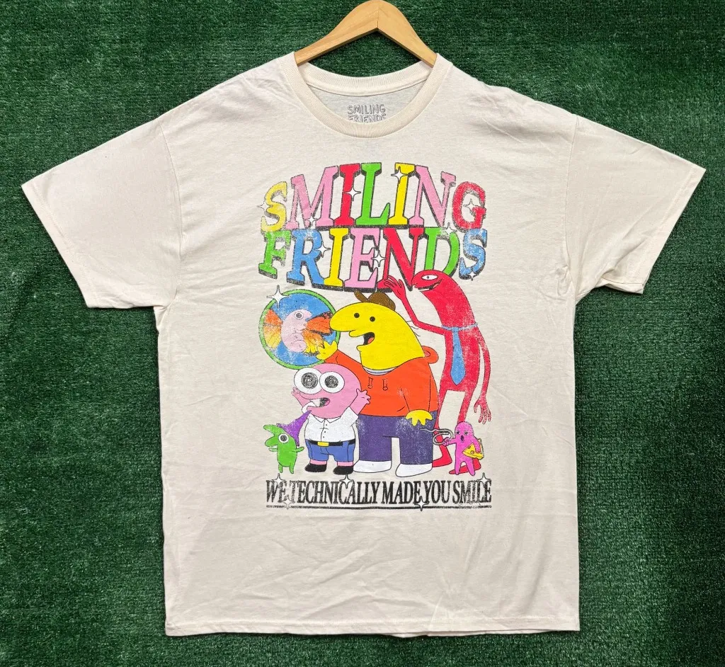 Cartoon Network Adult Swim Smiling Friends T-Shirt Size Extra Large measures 25 inches pit to pit 31 inches long Amazing shirt perfect for Smiling Friends fans New overstock in great condition