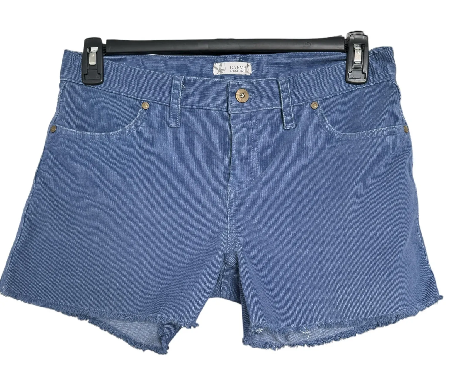 Carve Designs SZ 8 Oahu Corduroy Shorts * Stretch * Mid-Rise * Zip-Fly * Pockets * Raw, Frayed Hems * Slate Blue ***The fabric care/content tags are missing. Please measure an existing pair of shorts to make sure these are the right fit for you. Waist: 32" Inseam: 3 1/2" Rise: 8 3/4" Leg Opening Side to Side: 12" Measurements are approximate, laying flat and unstretched. Smoke free home. Thank you for supporting our small business!