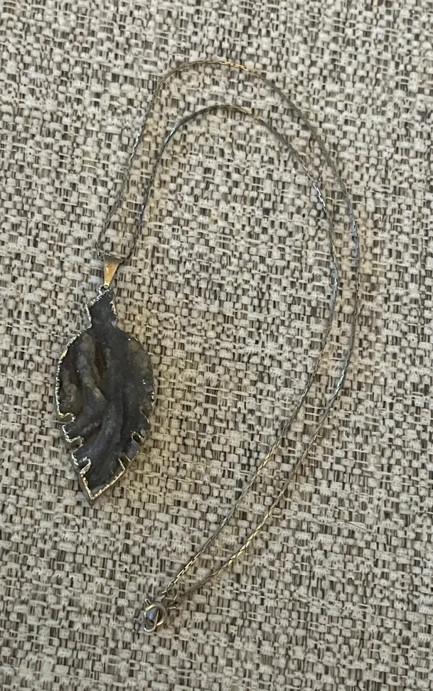 Carved Rock Geode Leaf Pendant Necklace Silver Setting Black - $25 - From Rebecca