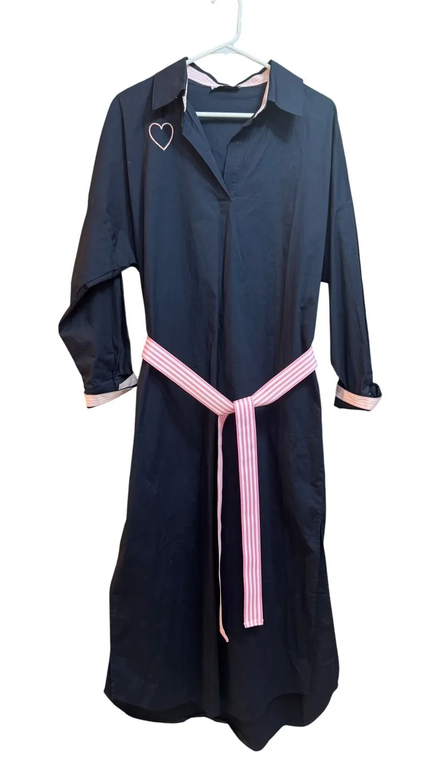 Navy blue shirt dress by Caryn Lawn. Features a classic collar, a V-neckline, and long sleeves with button cuffs. A delicate embroidered heart adorns the left chest. The dress includes a removable pink and white striped fabric belt to cinch the waist. The hemline is slightly curved. One Size fits most. Measurements: • Shoulder to Shoulder: 20 in • Bust: 40 in • Waist: 42 in • Hips: 44 in • Sleeve Length: 23 in • Total Length: 43 in Style: Shirt Dress Dress Length: Midi Department: Women Sleeve Length: Long Sleeve Pattern: Solid Occasion: Casual Material: Cotton, Spandex Fabric Type: Woven Theme: Bohemian Neckline: V-Neck Season: Spring, Summer, Fall Sleeve Type: Dolman Sleeve Closure: Tie Keywords: Caryn Lawn, shirt dress, navy dress, embroidered heart, striped belt, cotton blend, midi dress, collar dress, long sleeve dress, preppy, casual dress, day dress