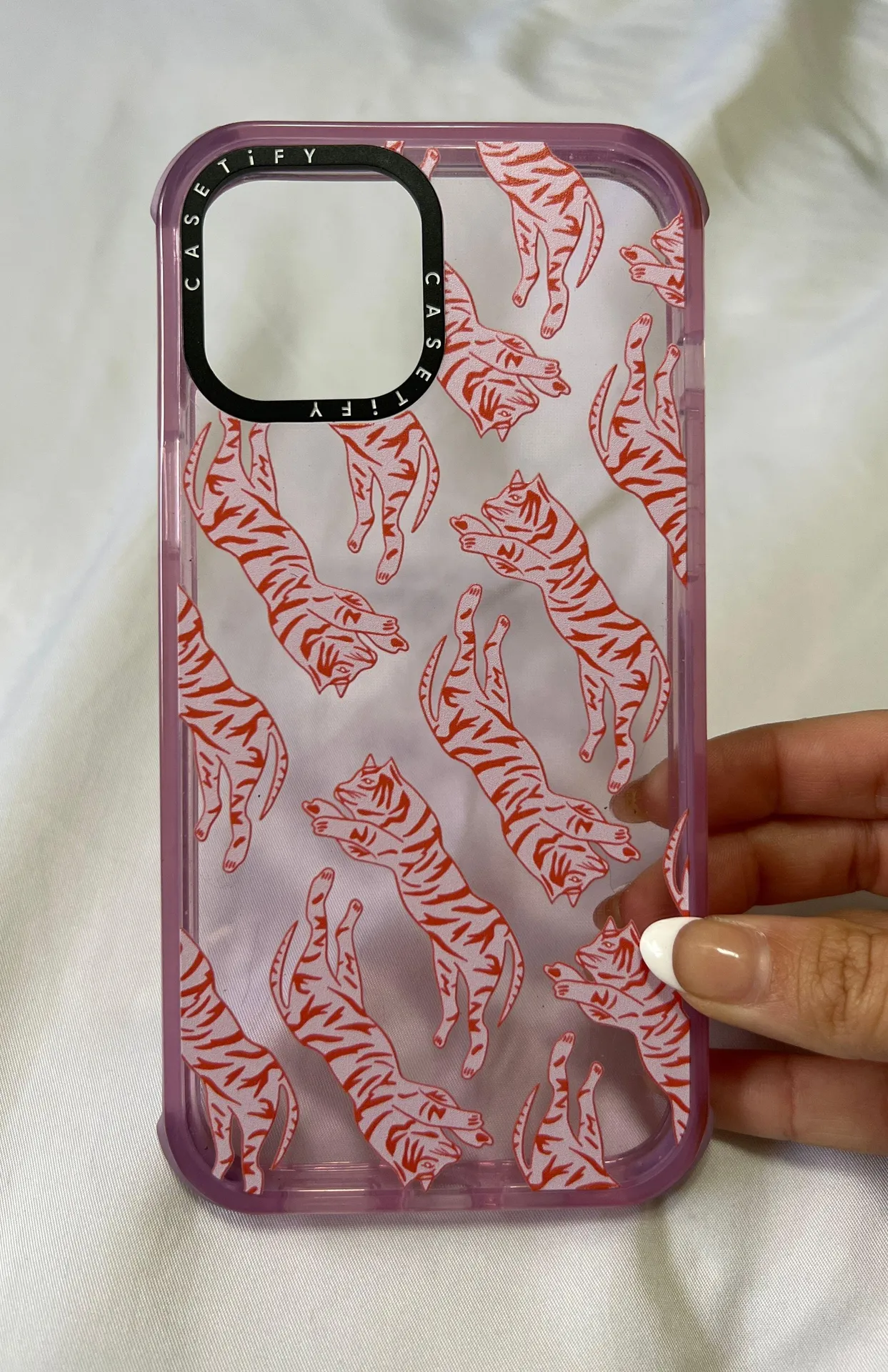 Purple back ground with neon pink tigers and purple bumpers. The bumpers keep the phone impact safe... Show more