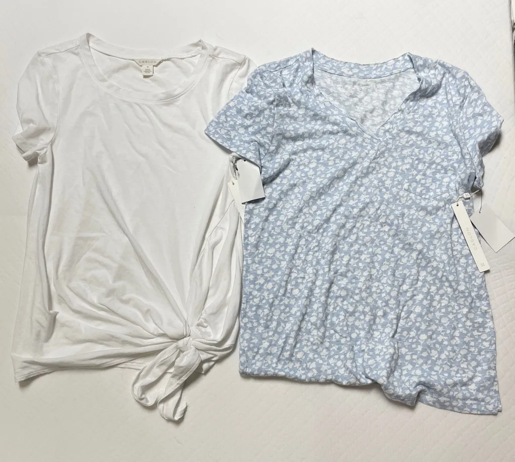Caslon Bundle of 2 white/blue Soft shirt sleeve shirts Women’s size xs/s - white shirt: size xs, tie front - blue: floral pattern, v-neck - NWT Please refer to the photos for measurements, condition, signs of wear or damages. This item has no flaws, stains or damages. Exact items pictured will be items shipped comfort, classic, preppy, coastal chic, spring fashion, cozy, soft, tagless