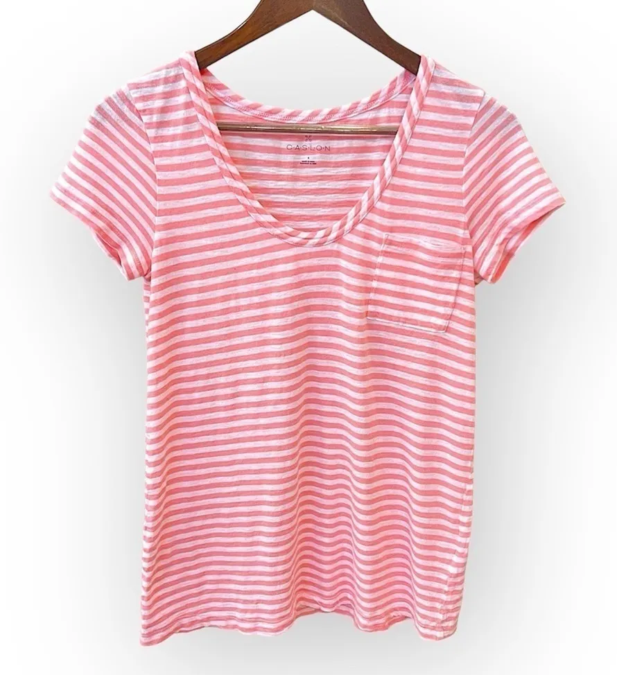 Caslon Modal/Cotton blend striped Tshirt, long fit, short sleeve, pink and white Size S (oversized) Very soft and lightweight Low rounded neckline Short sleeve Slight A-Line Chest pocket Preloved and in excellent condition, clean and steam sanitized. Please see pictures of aproximate measurements laid flat and fabric/care details. Smoke/Pet free home, ships ASAP! Bin 7