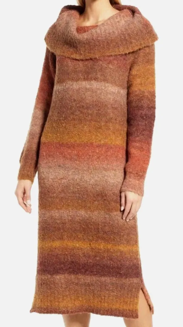 Caslon Ombré Striped Knit Long Sleeve Midi Sweater Dress Orange Brown Size XS/Small Excellent pre-owned condition FIT: Oversized, an XS would fit a Small as well A generous cowl neck tops this ultracozy sweater-dress knit from a wool-kissed yarn blend and striped in an autumnal, ombre style. Pullover. Long sleeves. Side slits. Unlined. Soft chunky knit fabric. Material: 34% recycled polyester 29% acrylic 27% polyester 8% wool 2% spandex. Striped pattern in shades of tan, brown, mustard yellow, and orange. + Offers welcome! + Color may vary with device and lighting + Smoke-free and pet-free home cozy boho bohemian soft 70s neutral