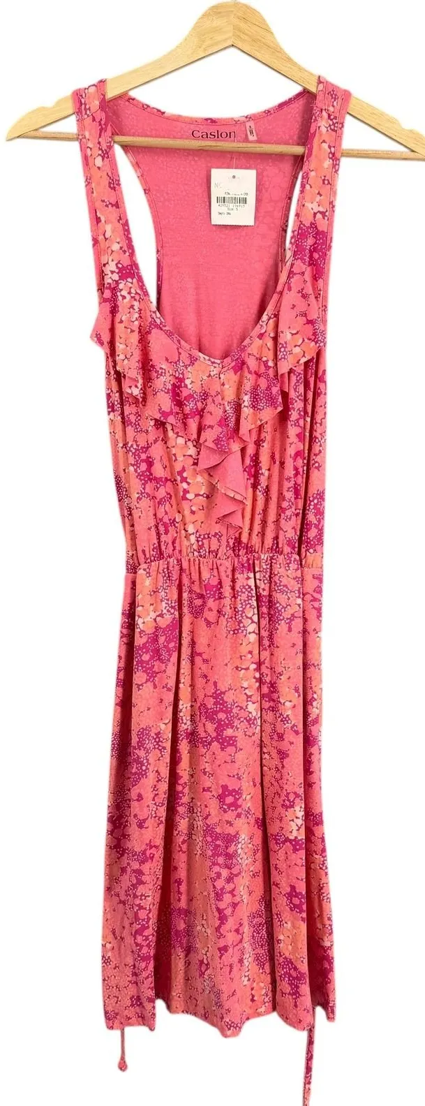 Caslon Pink Ruffle Sleeveless Dress – Women's Small A lovely casual dress by Caslon featuring a bright pink abstract print and a flattering fit-and-flare shape. Includes a ruffle front, elastic waist, and attached self-tie belt. Made from soft rayon-spandex fabric. Details: - Brand: Caslon - Size: Small - Color: Pink - Material: 95% Rayon, 5% Spandex - Made in Korea - Armpit to Armpit: 17" - Waist: 13" unstretched, 19" stretched - Length: 38" - Condition: Excellent pre-owned Keywords: caslon dress, pink ruffle dress, sleeveless belted midi, nordstrom dress, boho casual dress, womens small