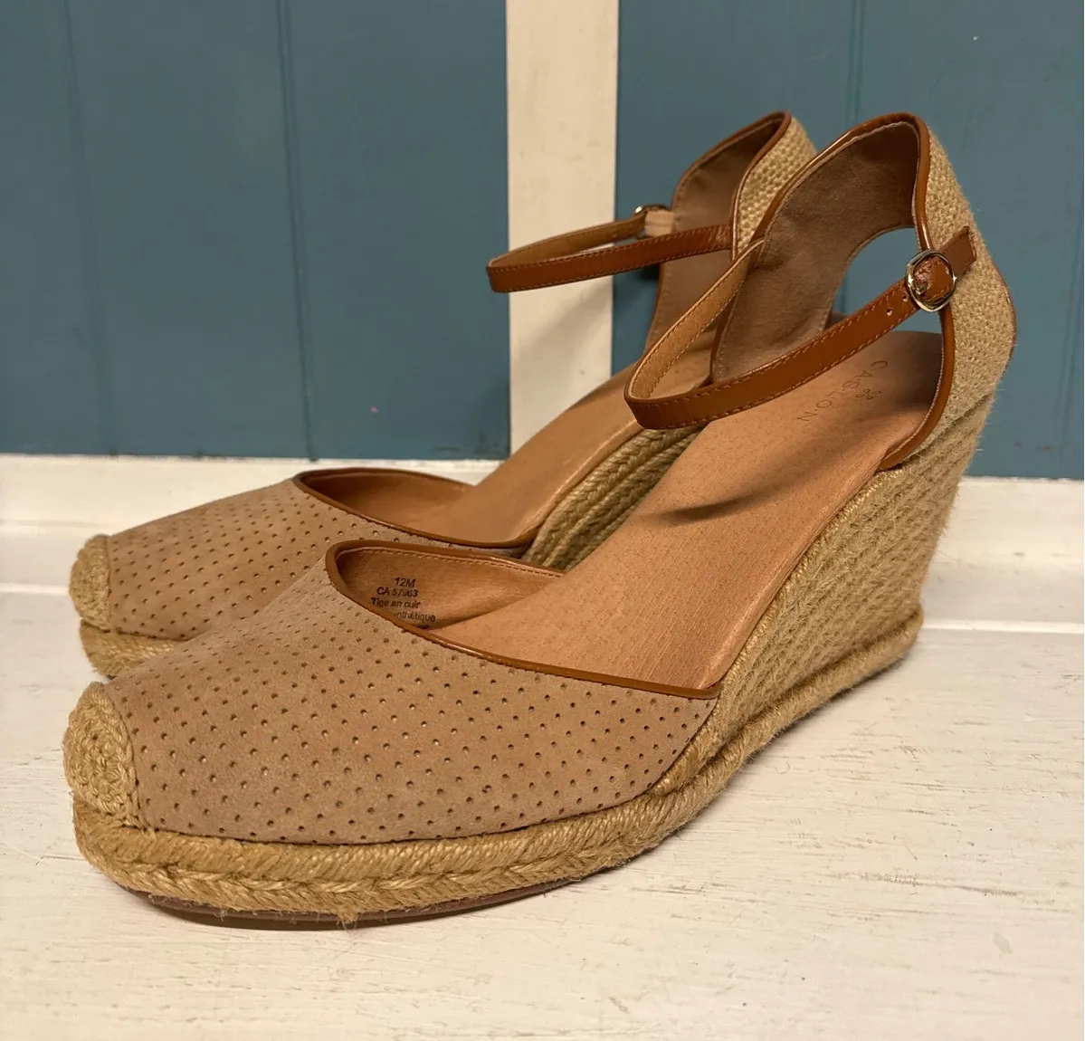 Elevate your warm-weather wardrobe with these chic CAS-LON espadrille wedges. The delicate perforation on the tan upper adds a touch of sophistication, while the classic jute-wrapped wedge and adjustable ankle strap offer both style and comfort. Perfect for a sunny day out or a casual evening stroll. Measurements: • Size: 12M Style: Espadrille Department: Women Upper Material: Suede Heel Style: Wedge Features: Adjustable Strap, Straps, Padded, Cushioned Closure: Buckle Pattern: Spotted Accents: Eyelet Heel Height: High (3-3.9 in) Type: Sandal Product Line: Aerosoles Conchlusion Insole Material: Leather Outsole Material: Rubber Keywords: espadrille, wedge, ankle strap, perforated, tan shoes, summer shoes, casual wedges, fashion sandals, comfortable, stylish, walkable, day to night, vacation ready