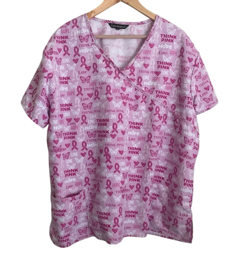 Cassandra Scrubs Women Top 2X Pink Medical Nurse Breast Cancer Awareness Well cared for condition -... Show more