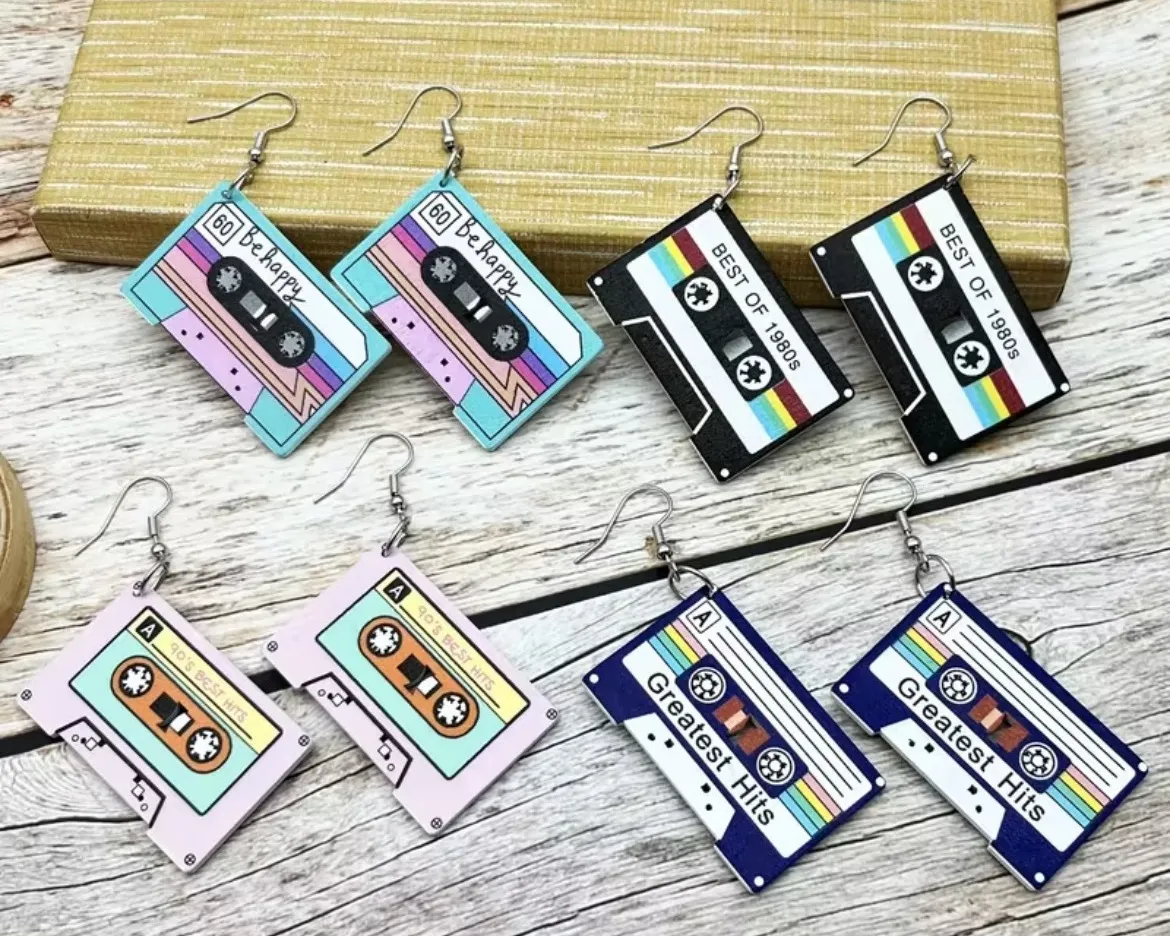 Retro cassette tape dangle earrings capturing the essence of 80s music. These unique earrings showcase playful designs reminiscent of vintage audio cassettes, with options like "Be Happy," "Best of 1980s," and "Greatest Hits." Perfect for adding a touch of nostalgia and fun to any outfit, these earrings are ideal for casual outings, music-themed events, or as a memorable gift for a music enthusiast. Style: Dangle/Drop Main Stone Color: Multicolor Closure: Hook Theme: Music & Dance, Letters, Numbers & Words, Fashion & Costumes Main Stone: No Stone Shape: Rectangle Type: Earrings Material: Plastic, Acrylic Ear Area: Lobe Secondary Stone: Glass Occasion: Birthday Era: Retro (1935-1950)