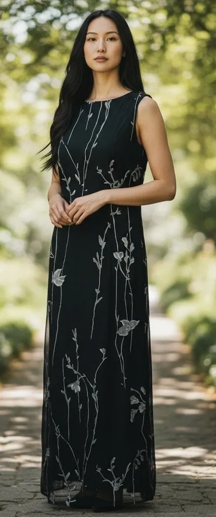Made in Italy Black chiffon dress with printed silver and black floral design Back Slit Pleated back and front Sheer Dress with silky polyester lining Pit to Pit 20" Neck to Hem 50" Used item in excellent condition, no flaws noted, see pics. Please check your measurements. Please double-check your shipping address before you send the payment. Evening Wear, Date Night, Fairy, Whimsey Goth, Formal Wear, Office Chic, Art to Wear, Holiday Events, Y2K, Maxi Dress, Ankle Length, Retro