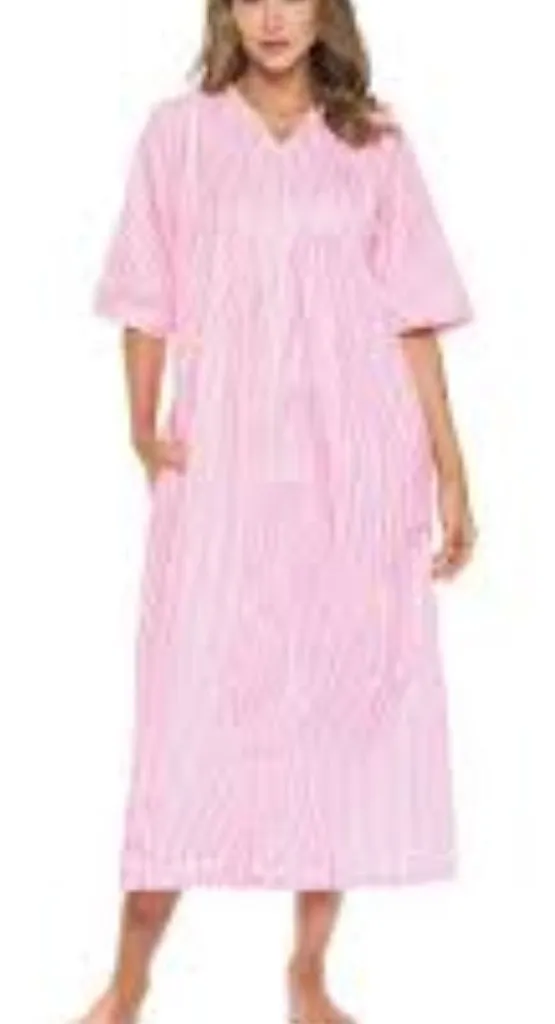 Features: Enjoy comfortable and modest lounging with this classic zip-front nightgown/housecoat by Casual Nights. Made from lightweight, breathable seersucker fabric in a charming pink and white vertical stripe. The full-length zipper makes it easy to slip on and off, while the delicate floral embroidery on the yoke adds a charming touch. Perfect for wearing around the house, sleeping, or recovering. • Style Profile: #plussize #3X #nightgown #housecoat #seersucker #zipfront #loungewear #maxi #sleepwear #modest #pinstripe #robe • Flaws: No Holes, stains, or tears • All measurements are approximate PTP: 28.5' Length: 51.5’