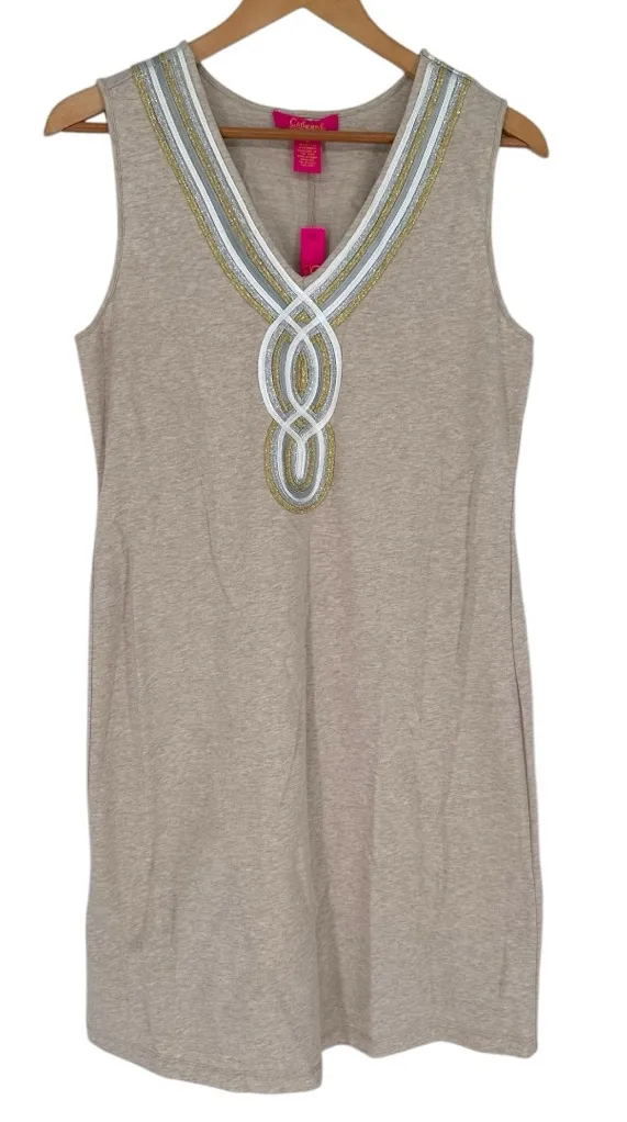 Cute little shift dress in an oatmeal heather fabric, accented by metallic silver, gold, and white trim in an interlocking design at neckline/chest. Unlined, has some stretch to it, sleeveless, v neck. No flaws, new with tags.
