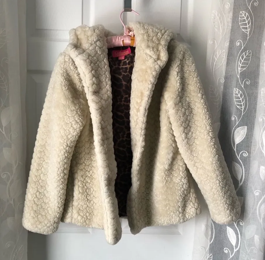 Catherines Malandrino Hooded Faux Fur Jacket coat Cream Color size 14/16, pre-owned good condition Stylish cream faux fur jacket with a cozy design. Perfect for adding elegance to any outfit.