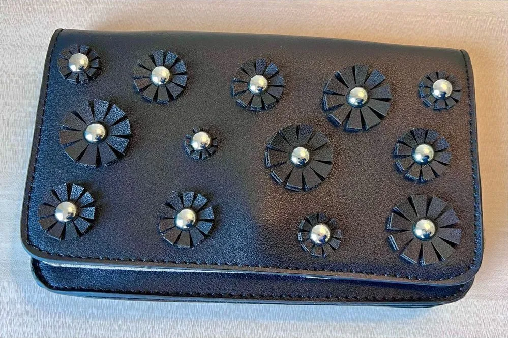 Catherine Malandrino Juliet Crossbody Purse Black Faux Leather Flowers Studs In great shape with no tears or stains. There is no handle or strap. It was used as a clutch and carried by actress on a popular television show. Super clean used for less than an hour. Please use the zoom feature the ensure that you agree with my assessment. Please look at the photos carefully as this will be the exact item you will receive. Please determine if the item is in acceptable condition to you before you bid. Please ask any questions you have before bidding. The photos are an integral part of the description, details and measurements.I usually ship out the same day payment is made. Always willing to accept reasonable offers. Thank you! Comes from a smoke free, pet free environment.