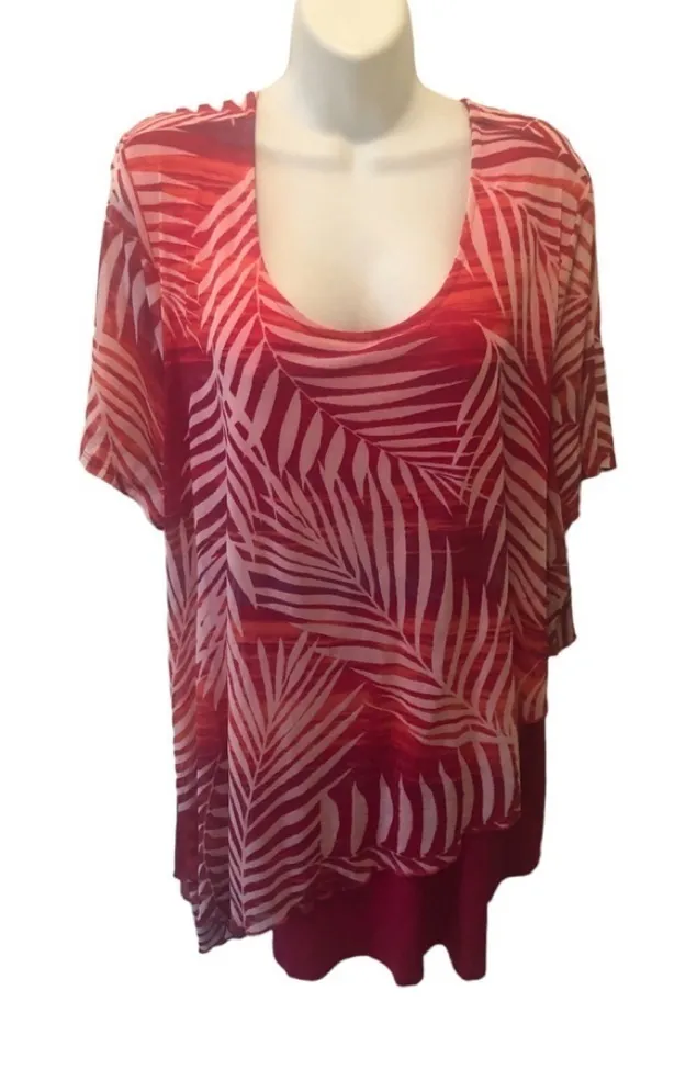 Catherine’s Plus Sz. 1X (18/20)Tropical Hot Pink Fern Tunic Top Layered Look Blouse Scoop neck Short... Show more