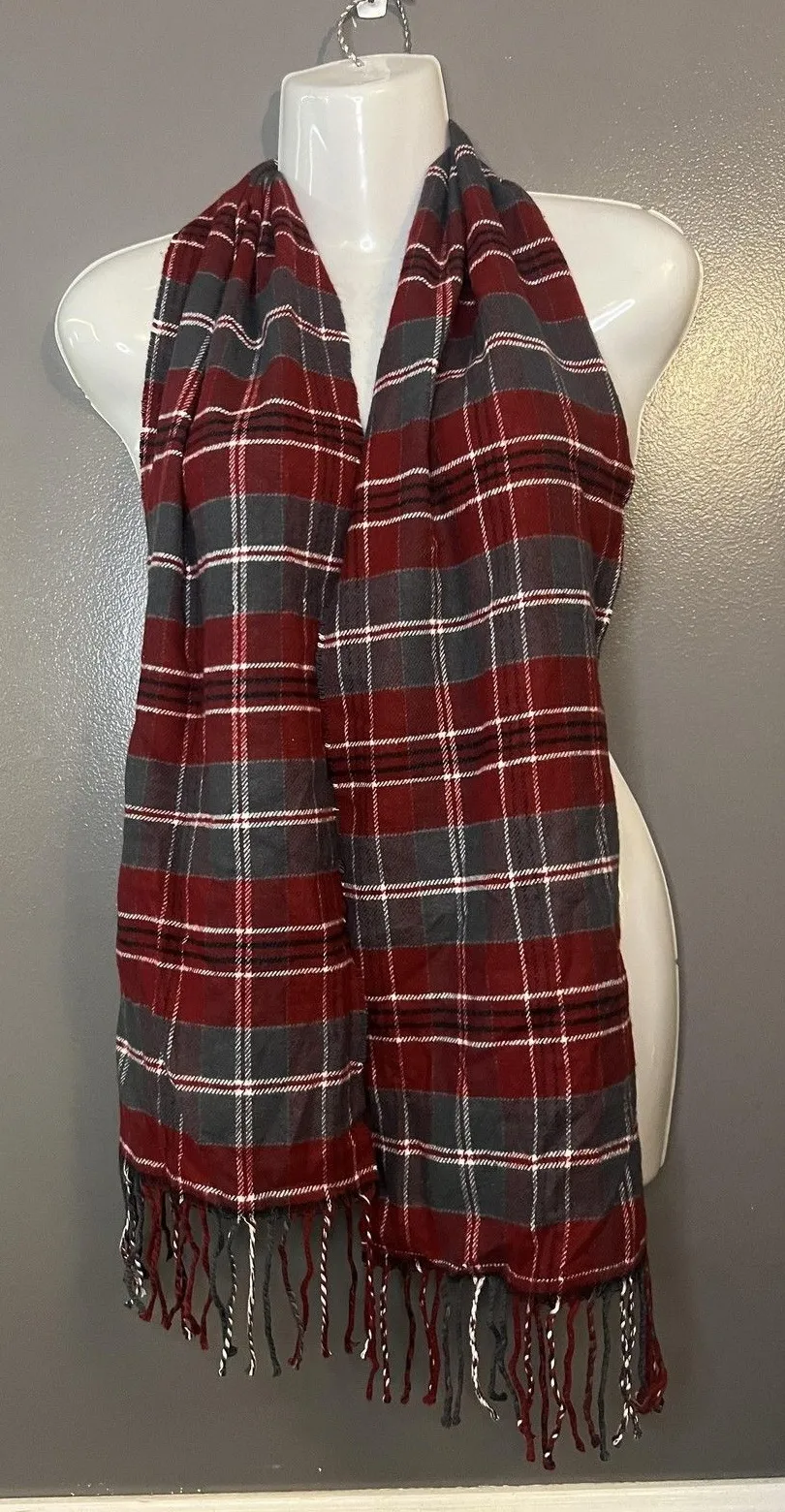 Brand: Catherines Item: Plaid scarf with fringed tassel ends Color: Red and gray with white plaid pattern Material: 100% Acrylic Size: One Size Features: Soft brushed feel; classic tartan-style plaid; fringed ends; cozy cold-weather accessory Labels/Tags: "CATHERINES" brand label Care instructions (from tag): Hand wash cold separately; non-chlorine bleach when needed; line dry; cool iron if needed Additional tag info: RN# 99249 | CS11070176 Notes: See photos for details and pattern/color confirmation. Width 10" Length 64" bin 50