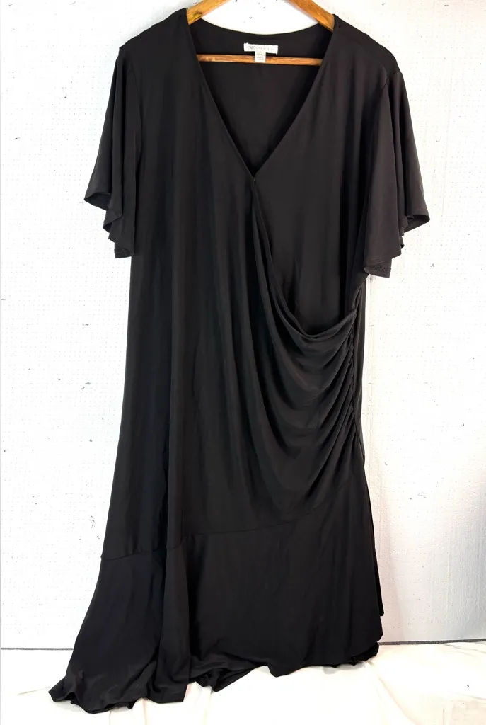 Excellent pre-owned condition Elegant black midi dress. Features short sleeves and a V-neckline. P... Show more