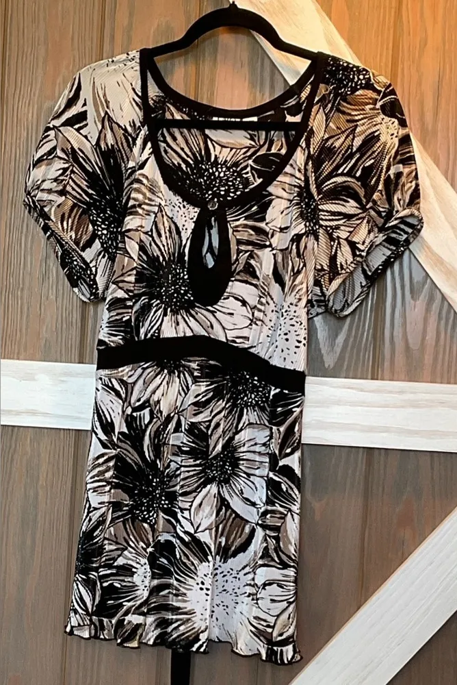 Stylish top by Cato. Features a black, tan and white color scheme. Key hole front. Tie in back. N... Show more