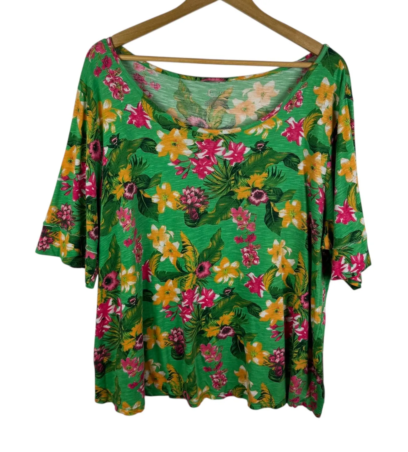 Keywords: floral top, womens top, plus size top, green floral, pink floral, yellow floral, summer top, casual top, boat neck top, short sleeve top, C Est 1946, 22/24W, womens plus size, floral print, Tropical Top, Floral Blouse, Resort Wear, Vacation Outfit, Boho Top, Lightweight Shirt, Summer Style, Cruise Wear, Bright Green, Scoop Neck, Flutter Sleeve, Beachwear, Aloha Style, Easy Fit, Relaxed Fit, Bohemian Clothing, Island Vibes, Travel Fashion