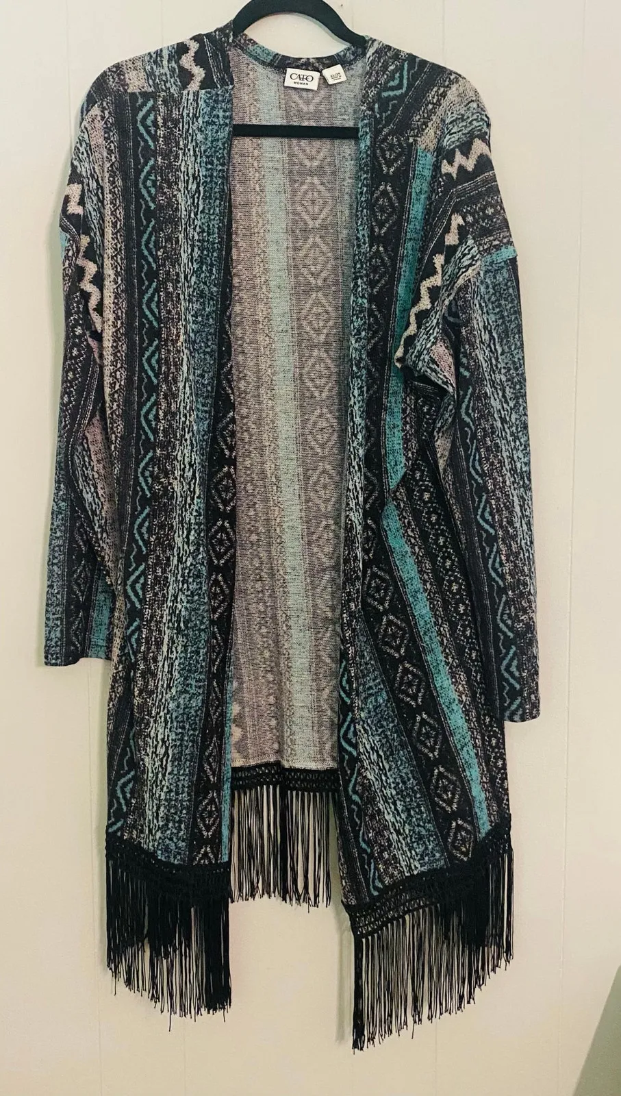 Cato Long Black Blue Grey Kimono Size 22/24 Fringe on the bottom Long Sleeve Excellent condition Non... Show more
