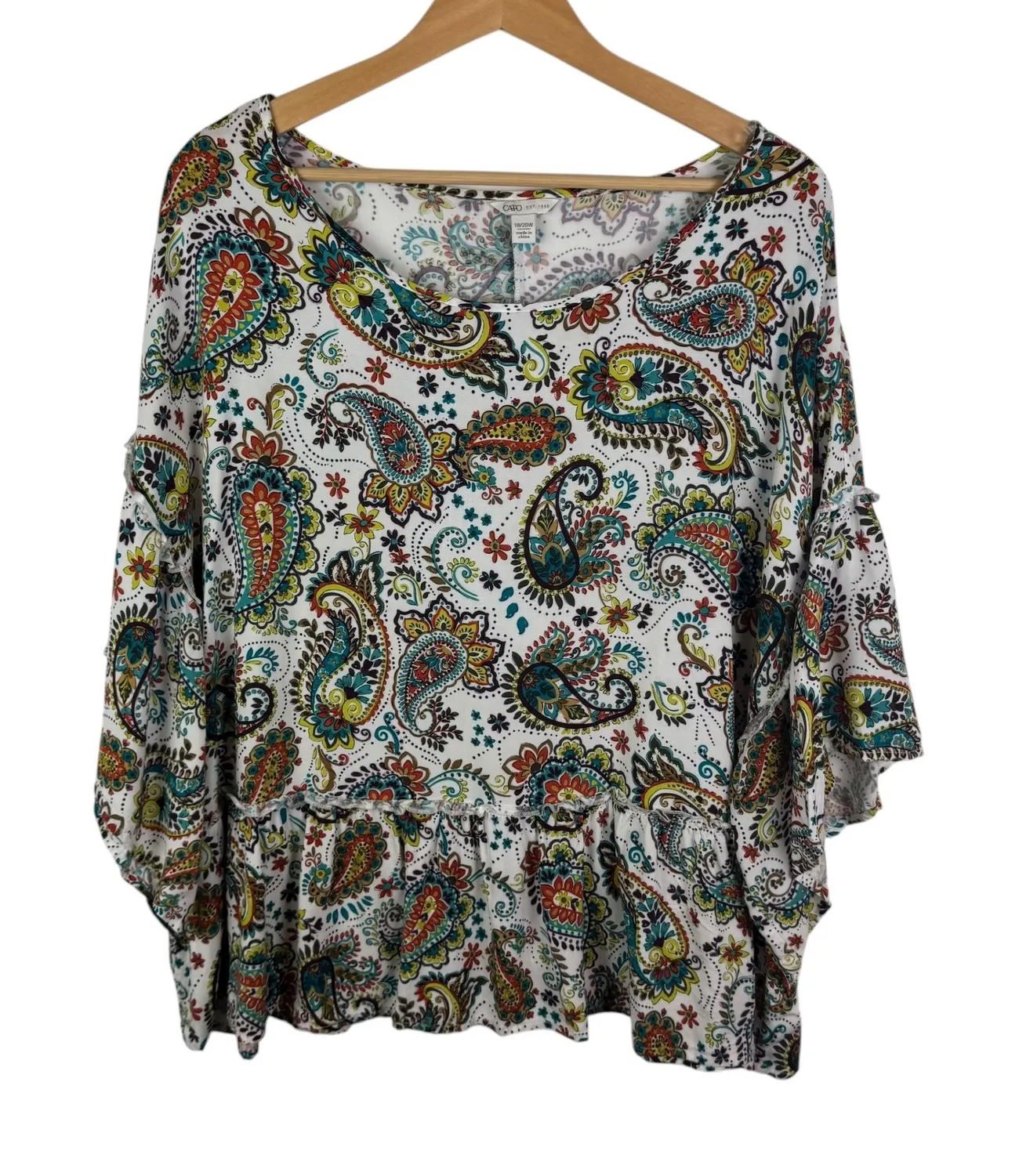 Keywords: Cato blouse, women's top, plus size blouse, paisley print, rayon top, peplum blouse, flutter sleeve top, bohemian style, casual top, brunch outfit, summer top, fall fashion, vibrant print, comfortable top, size 18 20W, Cato, Plus Size, 18W, 20W, Paisley, Boho, Festival, Flowy Top, Bright Print, Lightweight, Ruffle Hem, Bell Sleeve, Rayon Blouse, Vacation Style, Spring, Summer, Cottagecore, Whimsical, Colorful, Feminine, Retro, Statement Top