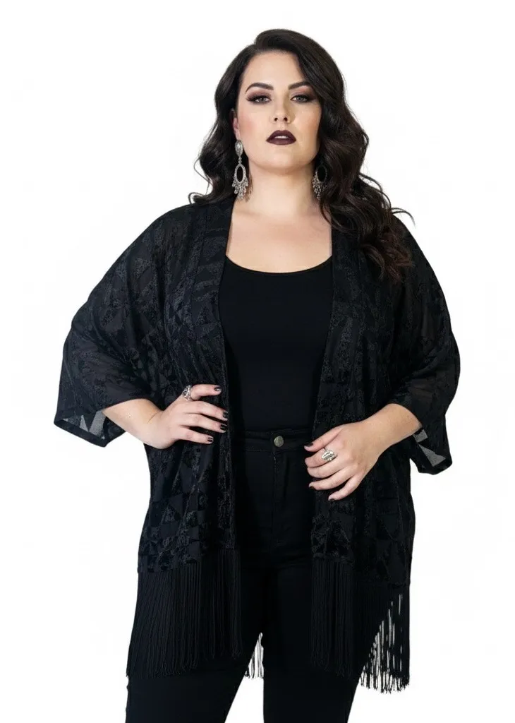 Fringe accents Burnout velvet fabric Woven Flowy Fit Geometric print Kimono sleeve Open Half Sleeves... Show more