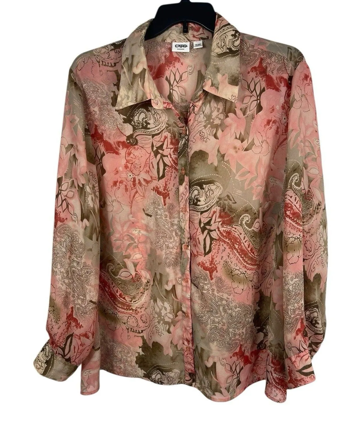 The Cato Woman Button Up Blouse in size 26/28W features a pink and tan floral paisley pattern on a s... Show more