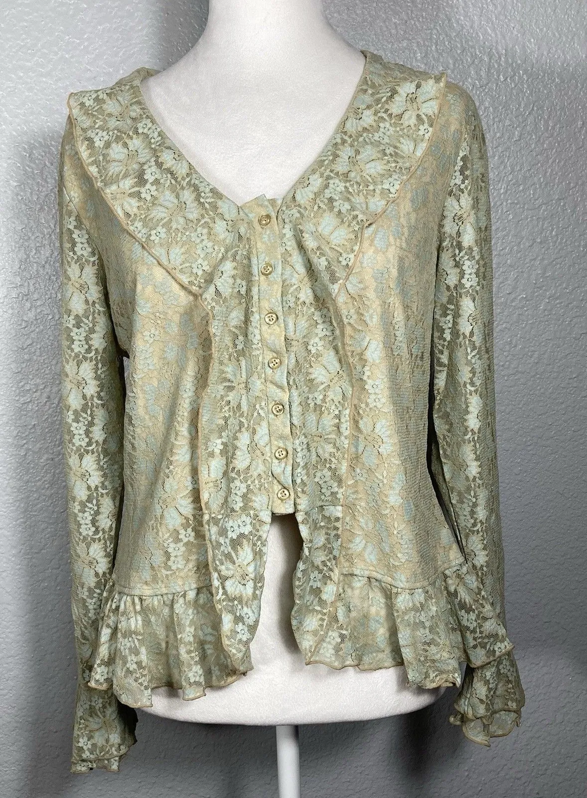 Womens Cream Nude Top L Floral Lace Victorian Blouse Ruffles Sheer Whimsical Fairy FAST SHIPPING S... Show more