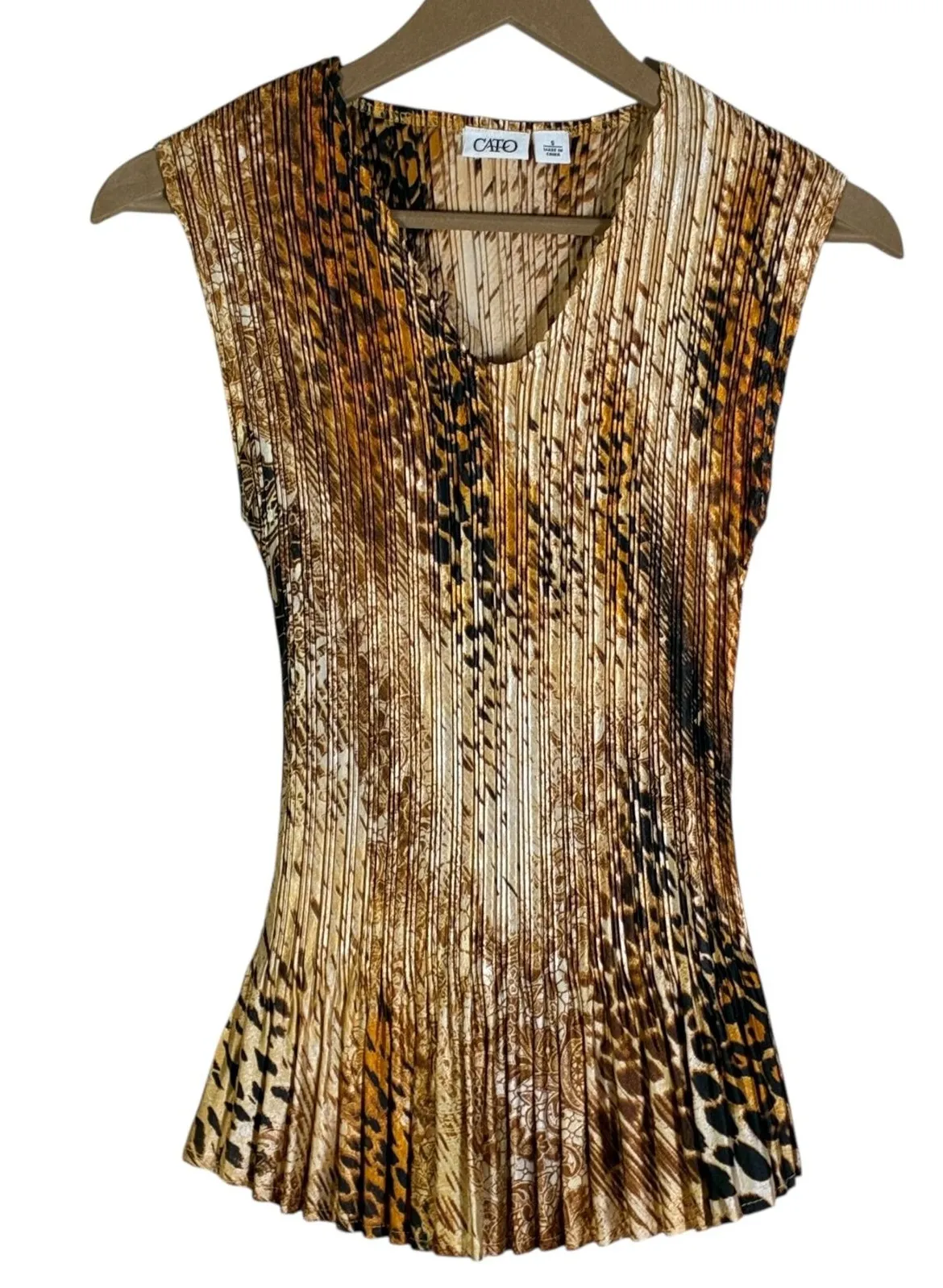 Sleeveless Pullover style V-neckline Accordion pleated texture Woven fabric 100% polyester material... Show more