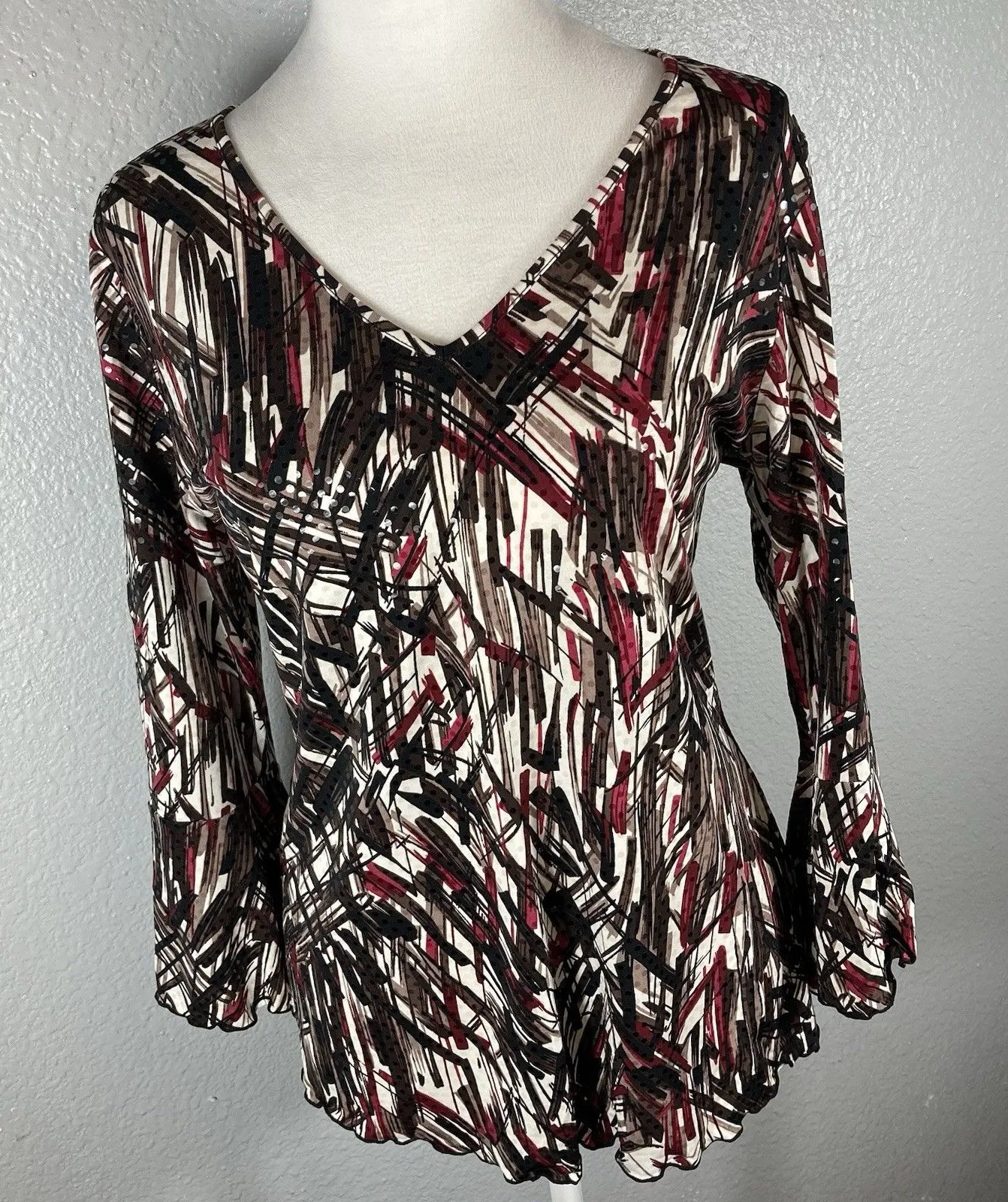 Catos Geometric Blouse Top S Shimmer Dots Shirt Stripe Print Bell Sleeve Career FAST SHIPPING Shou... Show more