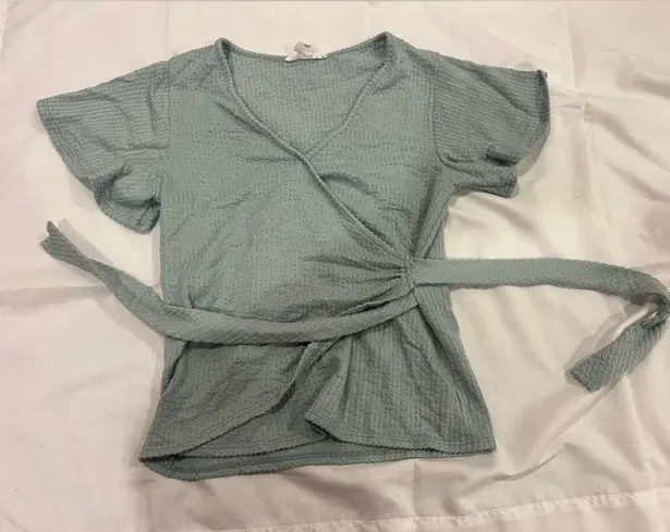 Stylish textured wrap top in a light green shade. Features a tie waist and short sleeves. Thermal kn... Show more