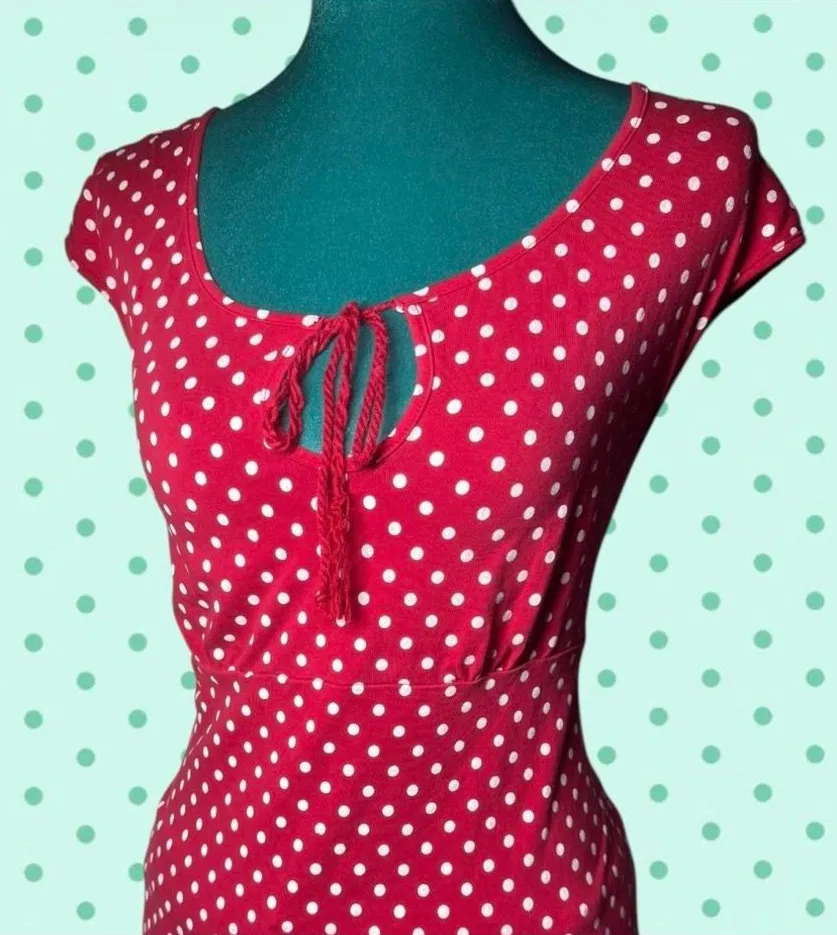Established 1962 red polka dot tie-front top - size L Red fitted top by Established 1962 featuring an allover white polka dot print. Scoop neckline with a cute tie-front keyhole detail and cap sleeves. Soft, stretchy fabric with a flattering silhouette—perfect for pin-up, retro, Y2K, or casual outfits. V Brand: Established 1962 V Size L V No flaws Size L - $21 - From milwaukee