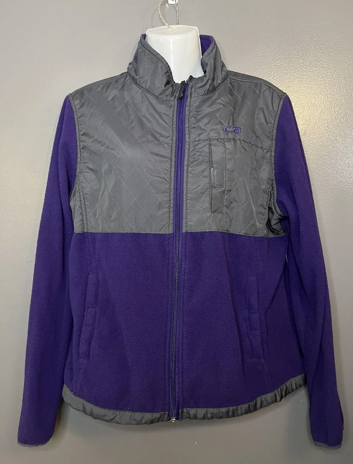 Gently worn with light overall wear to fleece. tabs on chest and hand pockets show some fuzzing and discoloration; zipper works smoothly. Brand: CB Sports Style: Womens full-zip jacket with quilted gray nylon upper yoke and collar over purple fleece body and sleeves. Color: Purple with gray contrast panels and trim. Size on tag: Large Material: Shell 100% polyester (per tag). Tag details: CB Sports logo at chest and inner tag, RN 59123, made in China. Details: Stand collar, full front zipper closure, quilted upper body for added warmth, fleece-lined body and sleeves, vertical chest pocket with closure, front hand pockets with closures, elasticized hem trim, soft cozy fleece interior, machine washable with care instructions printed on inside tag. PTP 22" Length 24" bin 76 2114