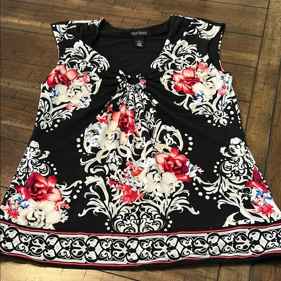 Stylish black top with vibrant red floral patterns. Elegant design with intricate details. White Ho... Show more