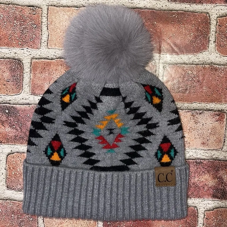 New C.C Beanie Gray Colorful Aztec Western Knit Hat Winter Ski Faux Fur Pom Unisex Casual Warm Fall... Show more
